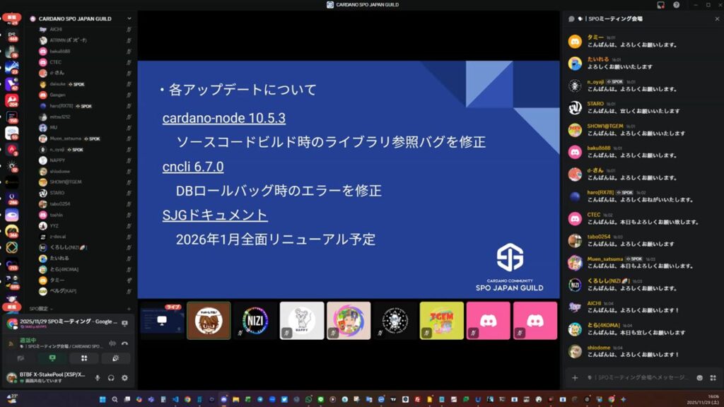 ・各アップデートについて -cardano-node 10.5.3 -cncli 6.7.0 -SJGドキュメント ・Q&A ・情報共有 2025/11/29 SPOミーティングアジェンダ